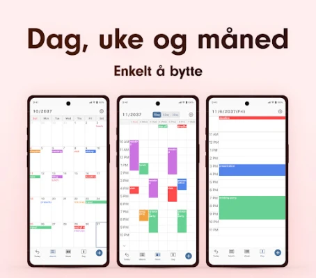 Simple Calendar utmerker seg med sin visuelle organisering, der fargekoding gir umiddelbar oversikt over din timeplan. Uansett om du foretrekker å se dagens gjøremål eller planlegge hele uken fremover, gjør de fleksible visningsmodusene det enkelt å skille mellom arbeid, studier, fritid og alt imellom. Bruk den som din pålitelige arbeidsplanlegger for å maksimere produktiviteten, en studieplanlegger for å holde oversikt over akademiske frister, eller som en husholdningsliste for å koordinere familieoppgaver – Simple Calendar tilpasser seg dine behov.
