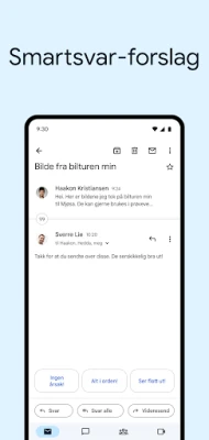 Effektiviser din arbeidsflyt med intelligente funksjoner designet for å spare deg tid og unngå feil. Med "Angre sending" kan du rette opp pinlige glipper før de blir sendt. La Smartsvar gi deg raske forslag til svar, slik at du kan håndtere e-post raskere. Organiser innboksen din med intuitive verktøy som merking, stjernemerking, arkivering eller sletting med et enkelt sveip, og rapporter uønsket post for en renere opplevelse. Skift uanstrengt mellom flere kontoer, del filer med letthet, og svar på Google Kalender-invitasjoner direkte i appen. Gmail tilbyr også lynraske søk, med umiddelbare resultater og forslag mens du skriver, samt autofyll av kontaktnavn fra dine Google- og telefonkontakter.