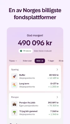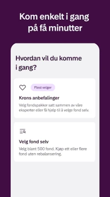 Reisen mot smartere sparing starter her, og den trenger ikke ta mer enn et par minutter. Med **Kron** kan du begynne din investeringsreise med et beskjedent beløp, kun 300 kroner. Svar på noen enkle spørsmål, og **Kron** skreddersyr en investeringsstrategi som passer perfekt for dine mål og din risikoprofil. Foretrekker du å ta roret selv? Dykk ned i et omfattende utvalg av nesten 500 kvalitetsfond og bygg din egen portefølje med frihet og fleksibilitet.
