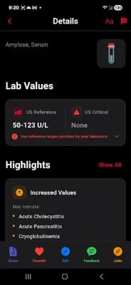 Gjennom et intuitivt grensesnitt blir det en lek å navigere i den enorme mengden data. Appen lar deg raskt finne relaterte laboratorieprøver ved å søke alfabetisk etter sykdommer, tilstander og symptomer. Tilpasningsmuligheter for laboratorieverdier og fargekoder for prøverør (tube tops) gir en personlig brukeropplevelse, mens en dedikert notatseksjon lar deg lagre egne observasjoner og viktige punkter. Bytt sømløst mellom amerikanske og SI-enheter, og benytt deg av direkte lenker til eksterne referanser for ytterligere utforskning og dypere forståelse.
