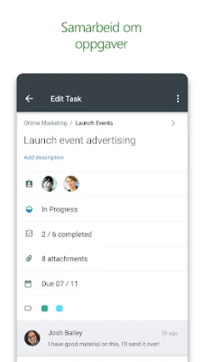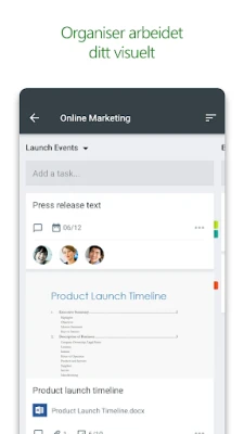 Planner er sømløst integrert med Office 365, noe som muliggjør uanstrengt samarbeid på felles planer. Teamet kan dele bilder direkte, og føre diskusjoner knyttet til spesifikke oppgaver uten å måtte veksle mellom forskjellige applikasjoner. All viktig kommunikasjon og deling av leveranser holdes trygt innenfor Planner, noe som forhindrer spredning av informasjon. Uansett om du er på kontoret eller på farten, sikrer Planner at alle er synkroniserte. Fortsett samtaler og oppdater prosjektfremdrift på tvers av alle enhetene dine, og hold teamet på samme side, alltid.