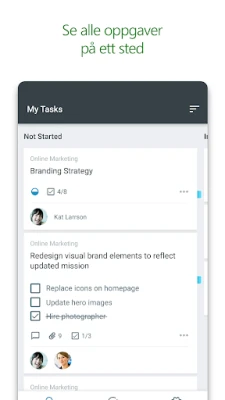 Hver plan i Planner utstyres med et dynamisk tavle der oppgaver kan organiseres i oversiktlige samlinger. Du kan enkelt kategorisere arbeidselementer basert på fremdriftsstatus eller hvem de er tilordnet. Å oppdatere en oppgaves status eller endre eierskap er gjort enkelt med en intuitiv dra-og-slipp-funksjon. For å sikre full oversikt over dine personlige bidrag, tilbyr "Mine oppgaver"-visningen en samlet liste over alle dine oppgaver og deres status på tvers av alle planer, slik at du alltid vet nøyaktig hva som krever din oppmerksomhet.